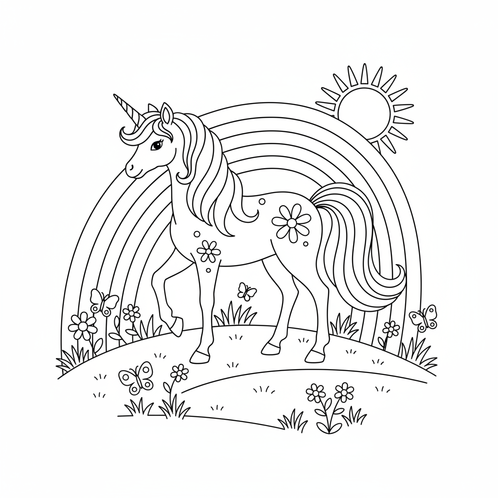 Beautiful unicorn with rainbow mane coloring page for kids and adults. Free to download and print.