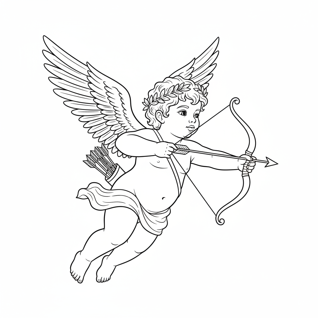 Beautiful cupid angel with bow and arrow coloring page for kids and adults. Free to download and print.