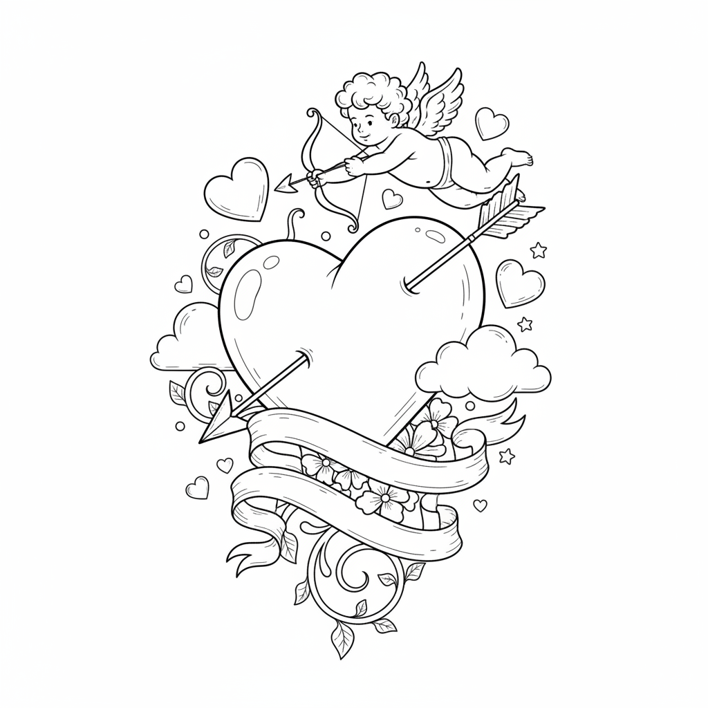 Beautiful heart with arrow cupid love coloring page for kids and adults. Free to download and print.