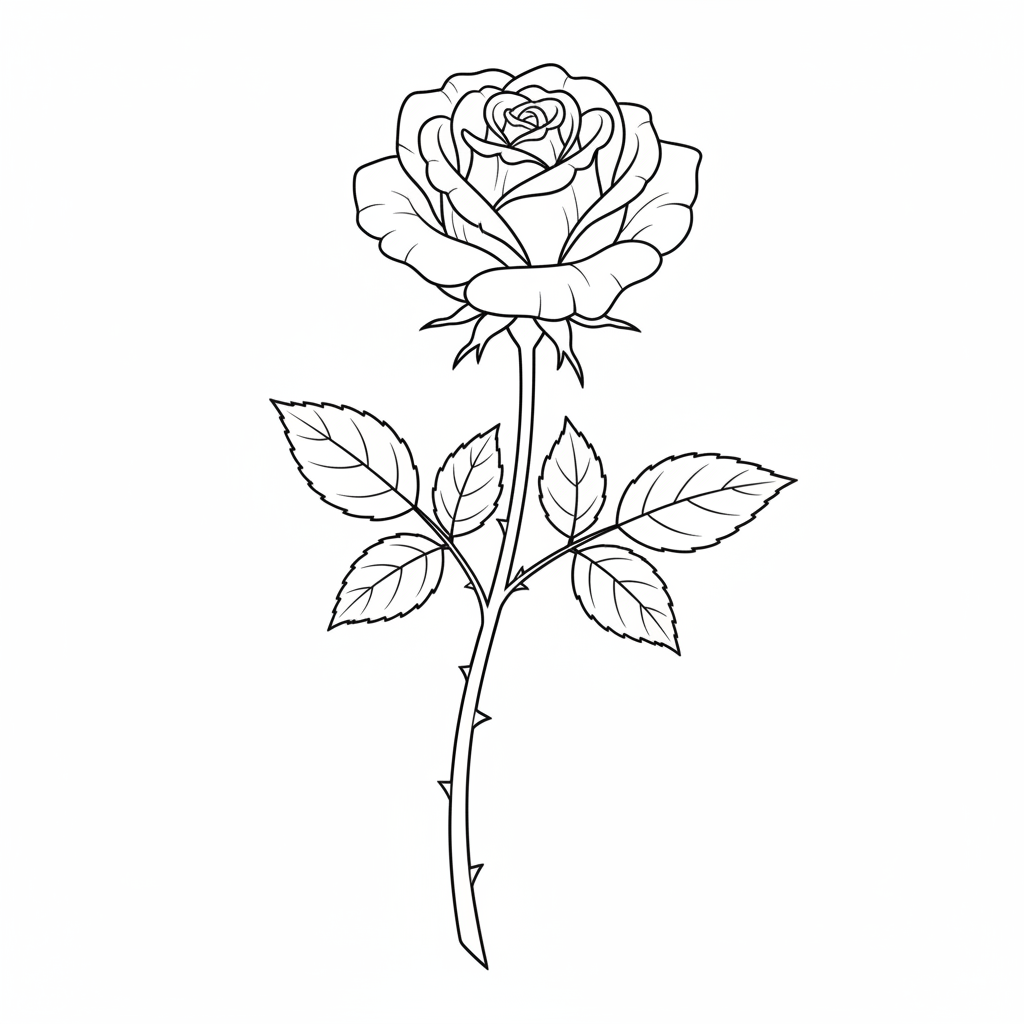 Beautiful single rose with stem and leaves coloring page for kids and adults. Free to download and print.