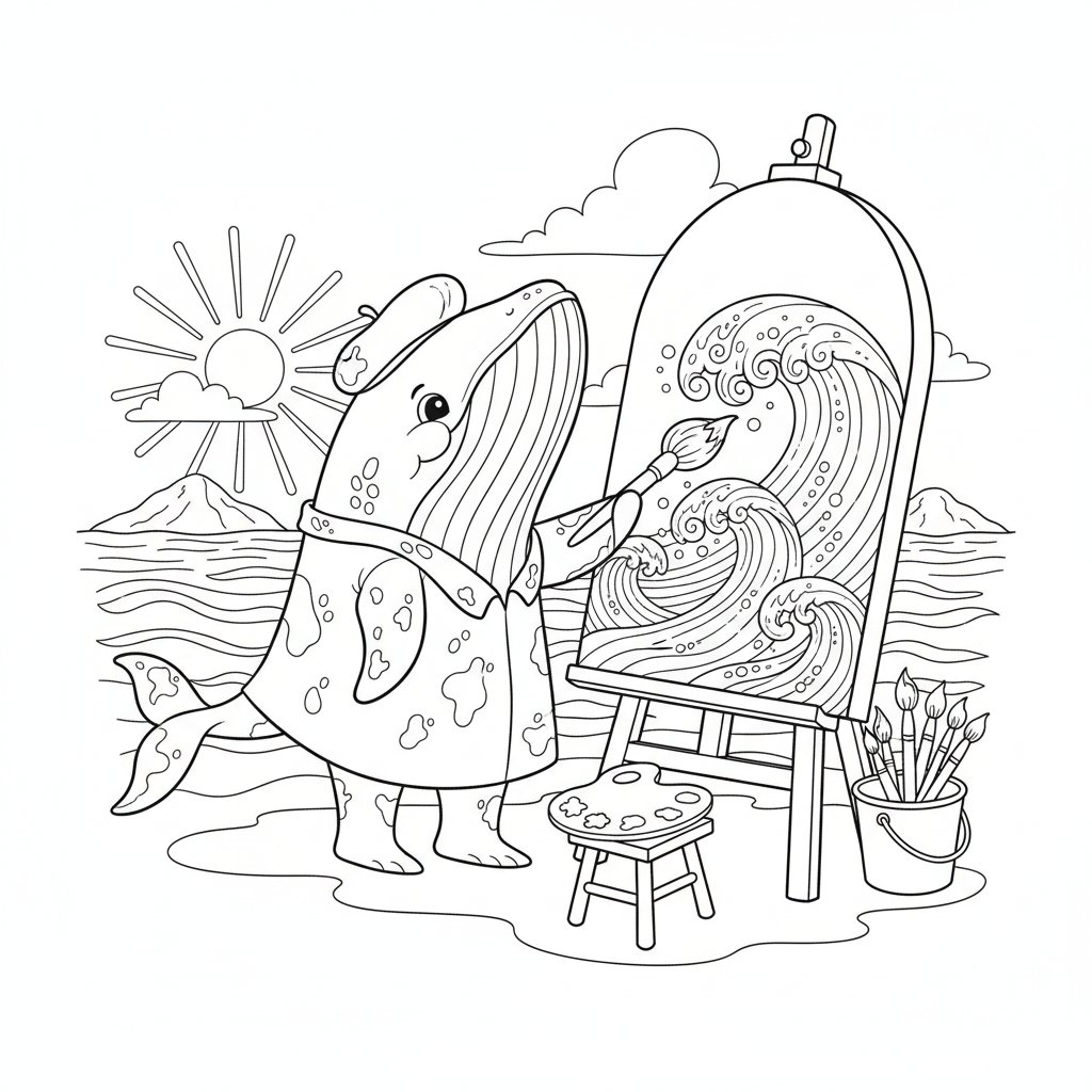 Beautiful whale artist painting waves coloring page for kids and adults. Free to download and print.