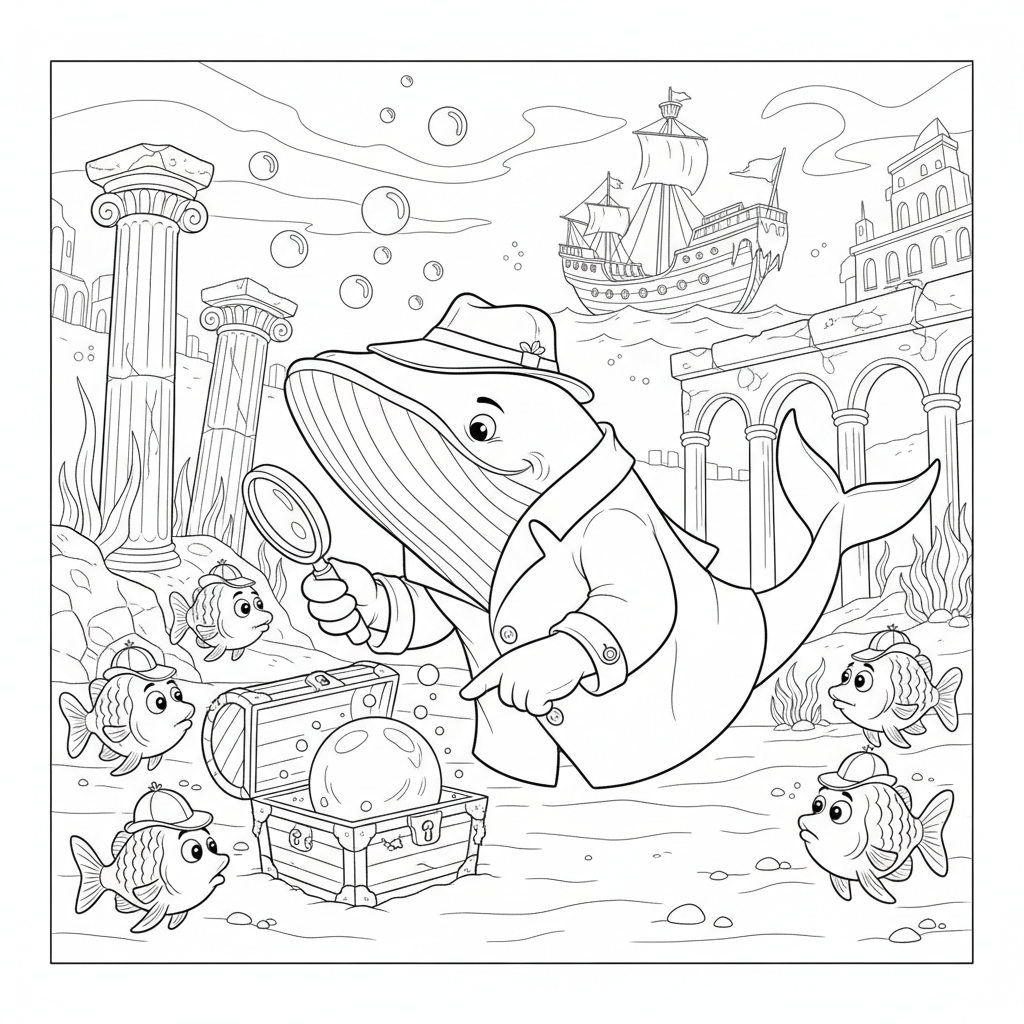 Beautiful whale detective mystery coloring page for kids and adults. Free to download and print.