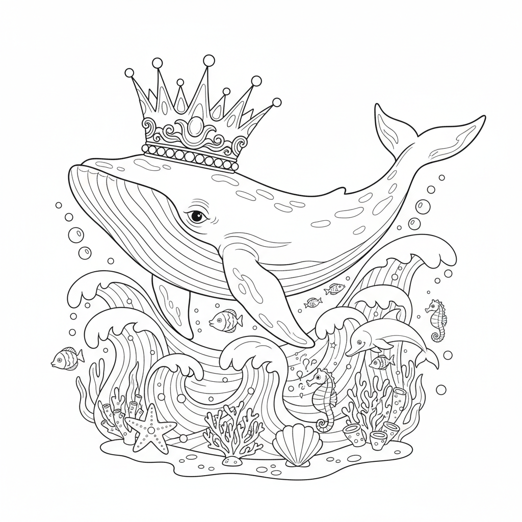 Beautiful whale king crown ocean coloring page for kids and adults. Free to download and print.