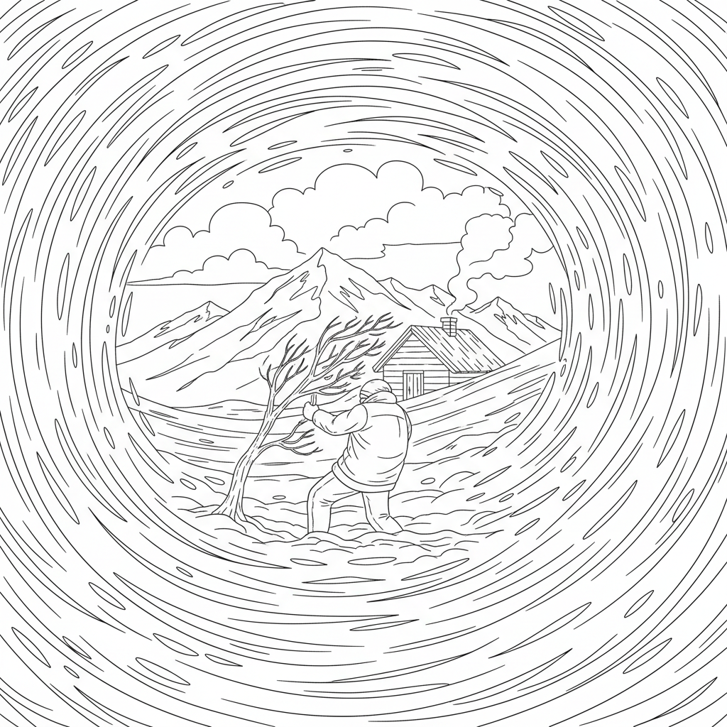 Beautiful blizzard scene with swirling snow coloring page for kids and adults. Free to download and print.