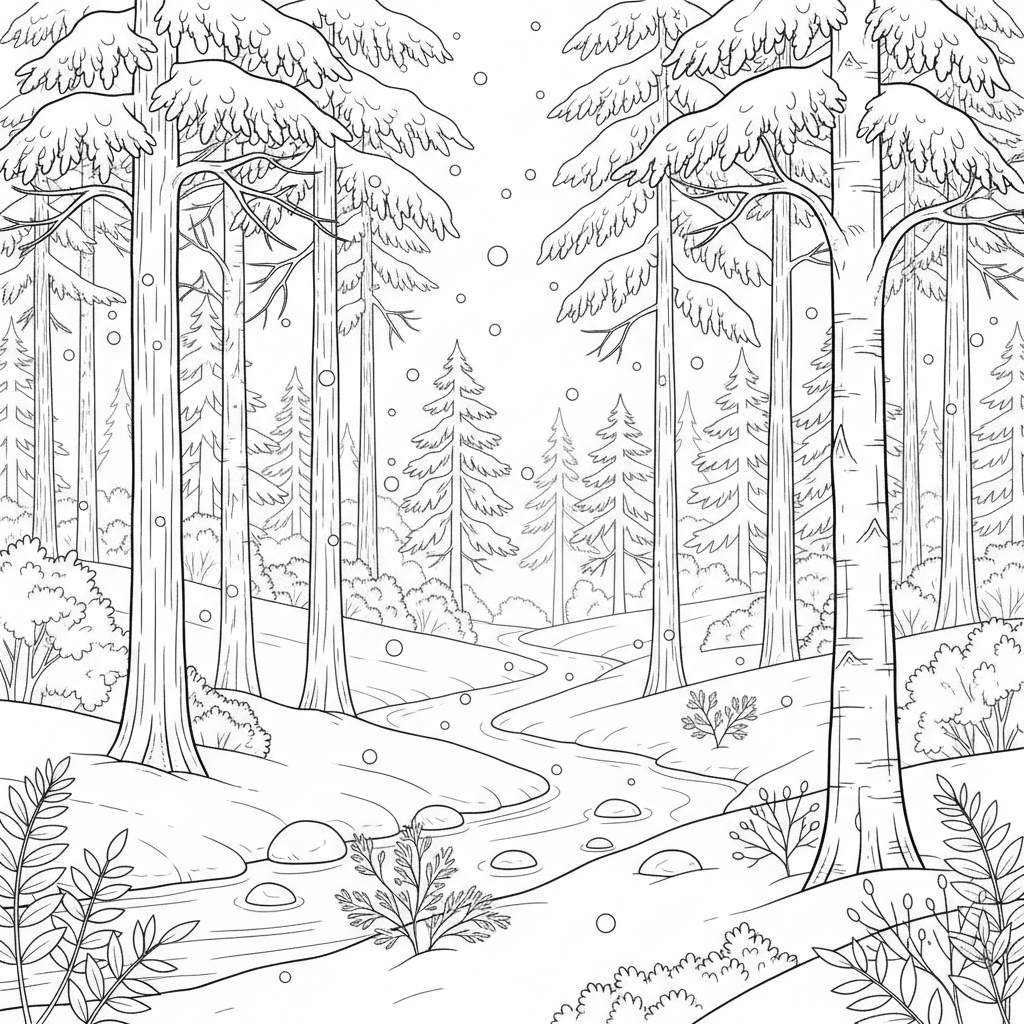 Beautiful gentle snowfall in quiet forest coloring page for kids and adults. Free to download and print.