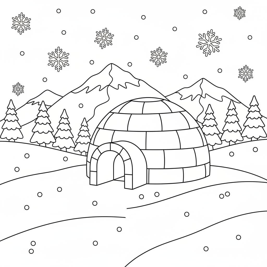 Beautiful igloo in snowy landscape coloring page for kids and adults. Free to download and print.