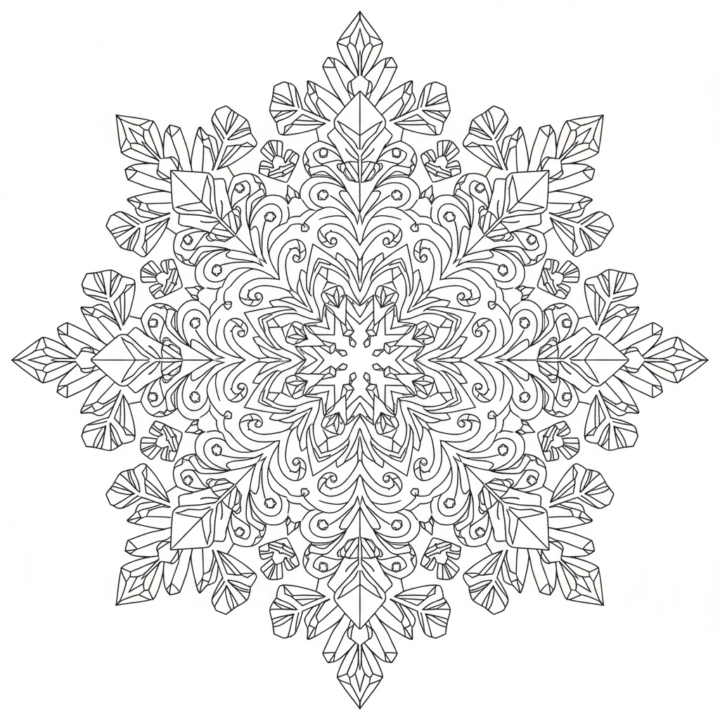 Beautiful intricate snowflake detailed crystal pattern coloring page for kids and adults. Free to download and print.