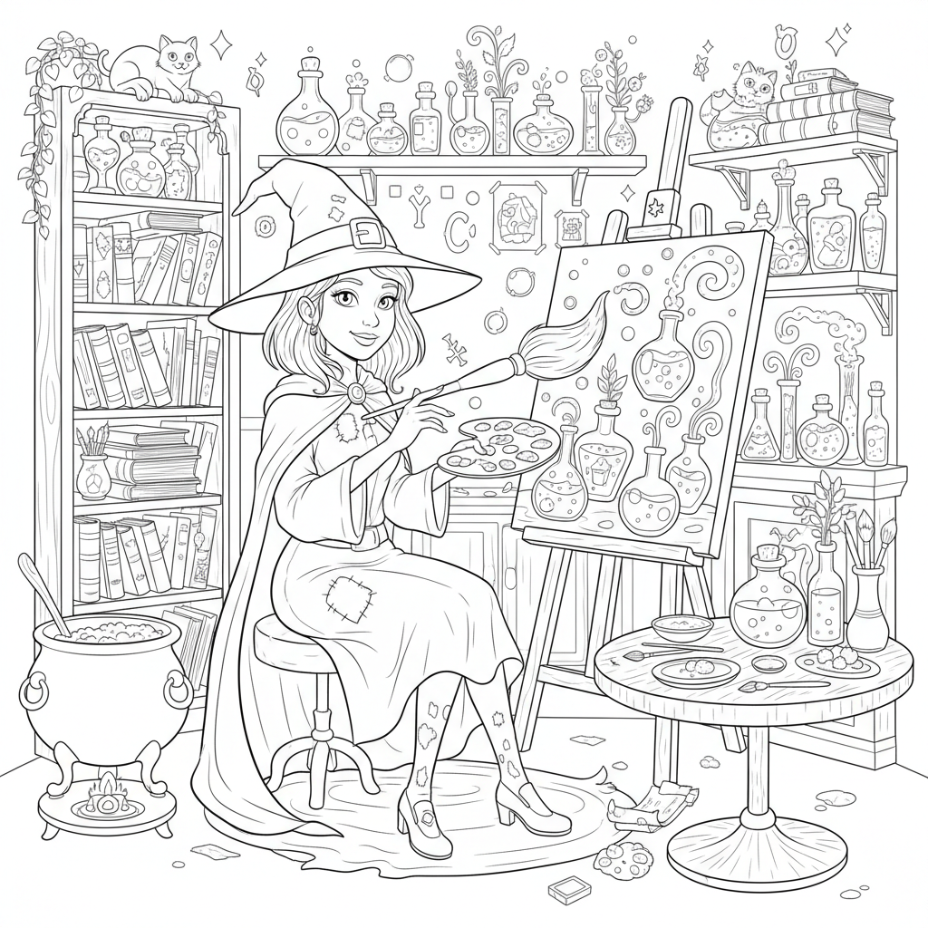 Beautiful witch artist painting potions coloring page for kids and adults. Free to download and print.