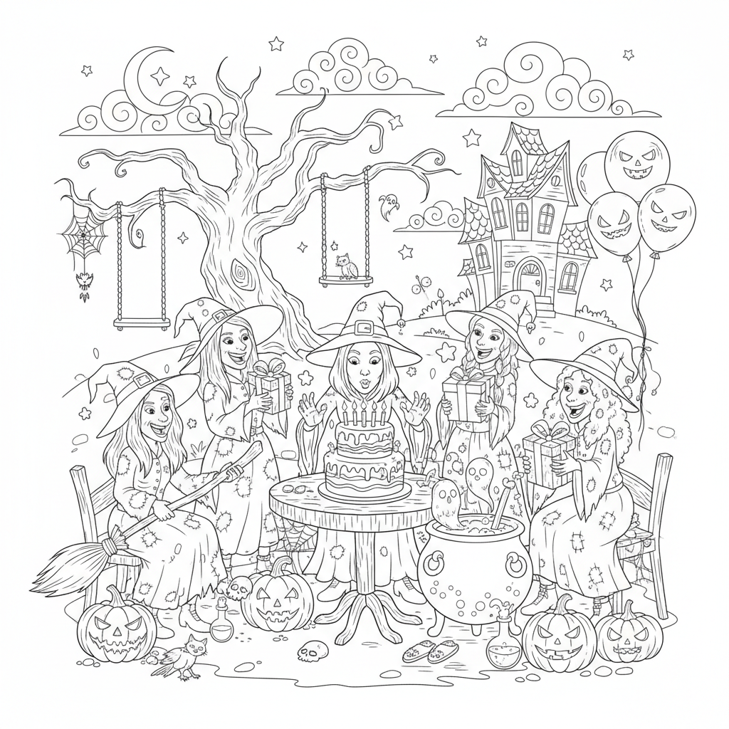 Beautiful witch birthday party spooky coloring page for kids and adults. Free to download and print.