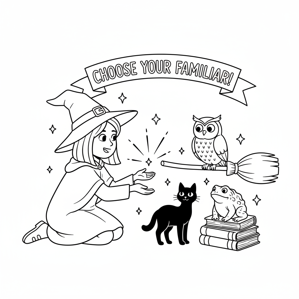 A delightful witch coloring page featuring witch familiar choosing pet cat owl toad bond. Perfect for kids and adults who love coloring!