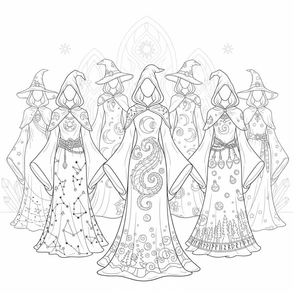Beautiful witch fashion show robes coloring page for kids and adults. Free to download and print.
