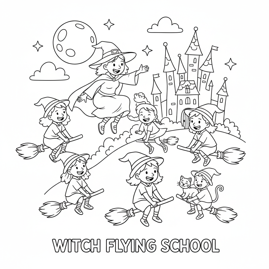 A delightful witch coloring page featuring witch flying lesson broomstick school training. Perfect for kids and adults who love coloring!