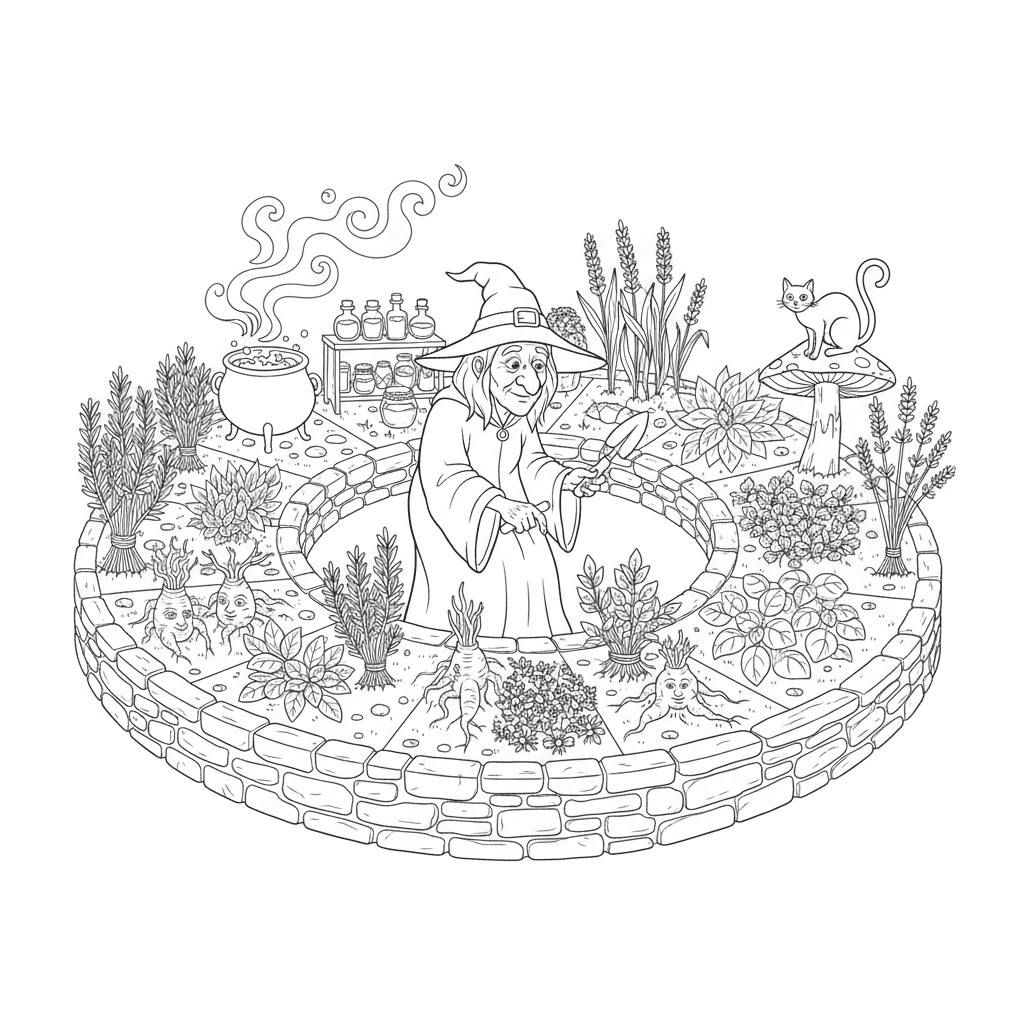 Beautiful witch garden growing herbs coloring page for kids and adults. Free to download and print.