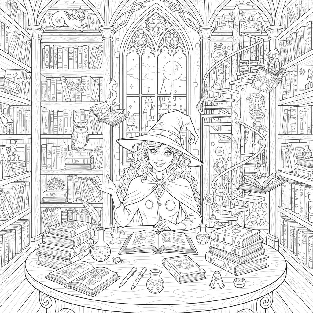 Beautiful witch library magical books coloring page for kids and adults. Free to download and print.