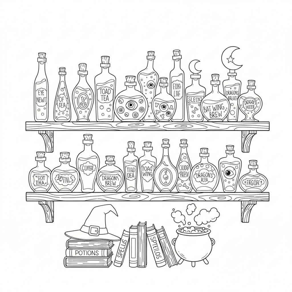 A delightful witch coloring page featuring witch potion bottles collection shelves variety colors. Perfect for kids and adults who love coloring!