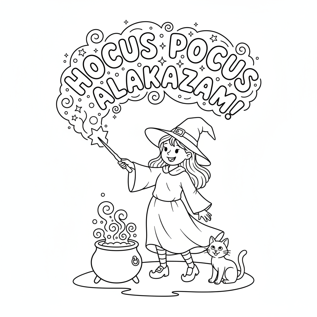 A delightful witch coloring page featuring witch spell casting incantation magical words glow. Perfect for kids and adults who love coloring!