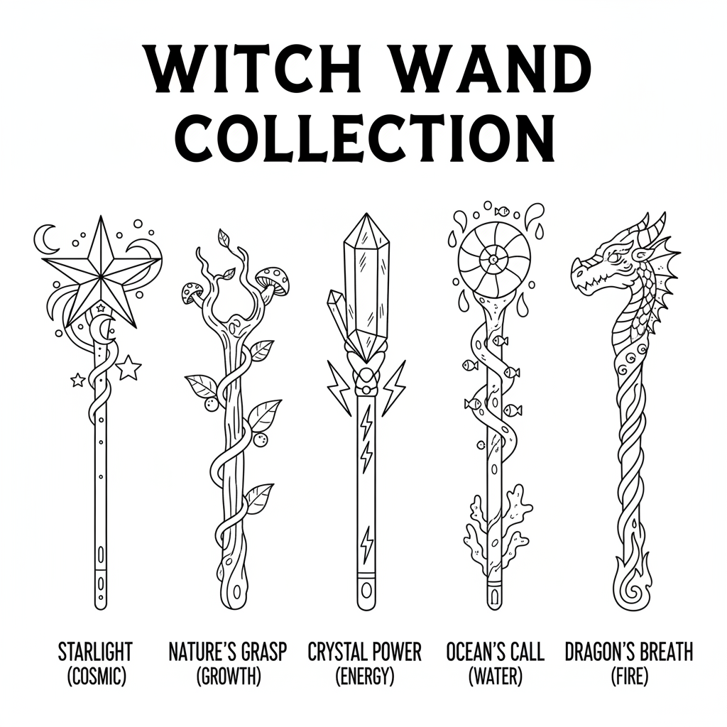 A delightful witch coloring page featuring witch wand collection variety powers magical tools. Perfect for kids and adults who love coloring!