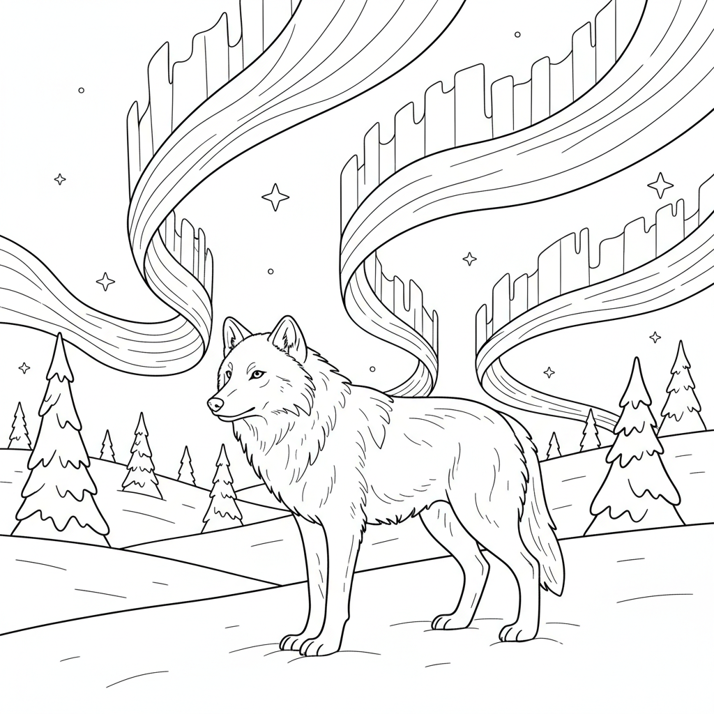 A delightful wolf coloring page featuring arctic white wolf standing in a snowy tundra landscape with northern lights. Perfect for kids and adults who love coloring!