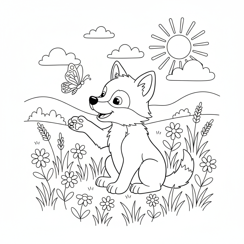 A delightful wolf coloring page featuring friendly wolf cub playing with a butterfly in a meadow. Perfect for kids and adults who love coloring!