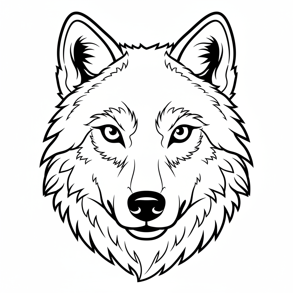 A delightful wolf coloring page featuring gray wolf portrait with piercing eyes looking directly forward. Perfect for kids and adults who love coloring!