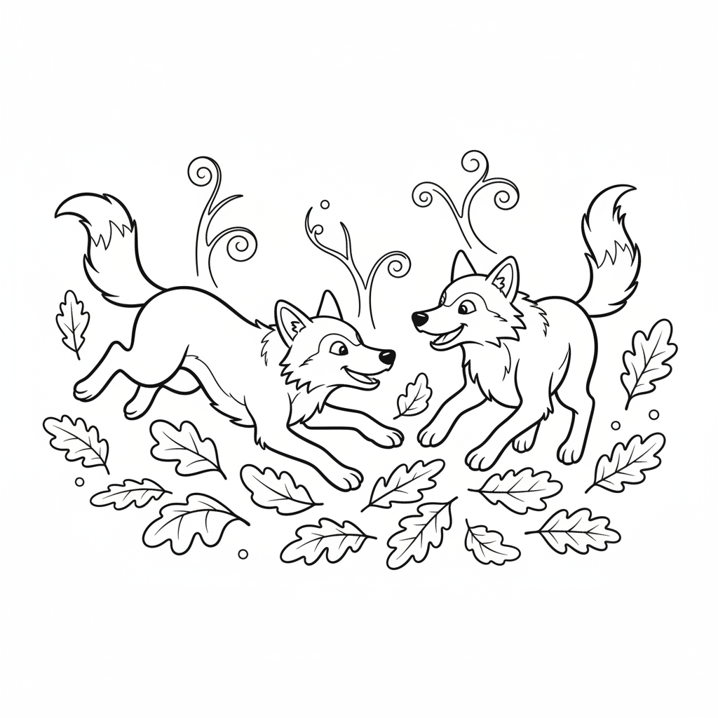 A delightful wolf coloring page featuring two wolves playing and chasing each other through autumn leaves. Perfect for kids and adults who love coloring!