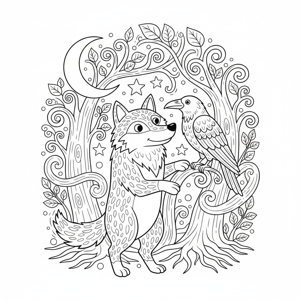 A delightful wolf coloring page featuring wolf and raven together in a mystical forest scene. Perfect for kids and adults who love coloring!
