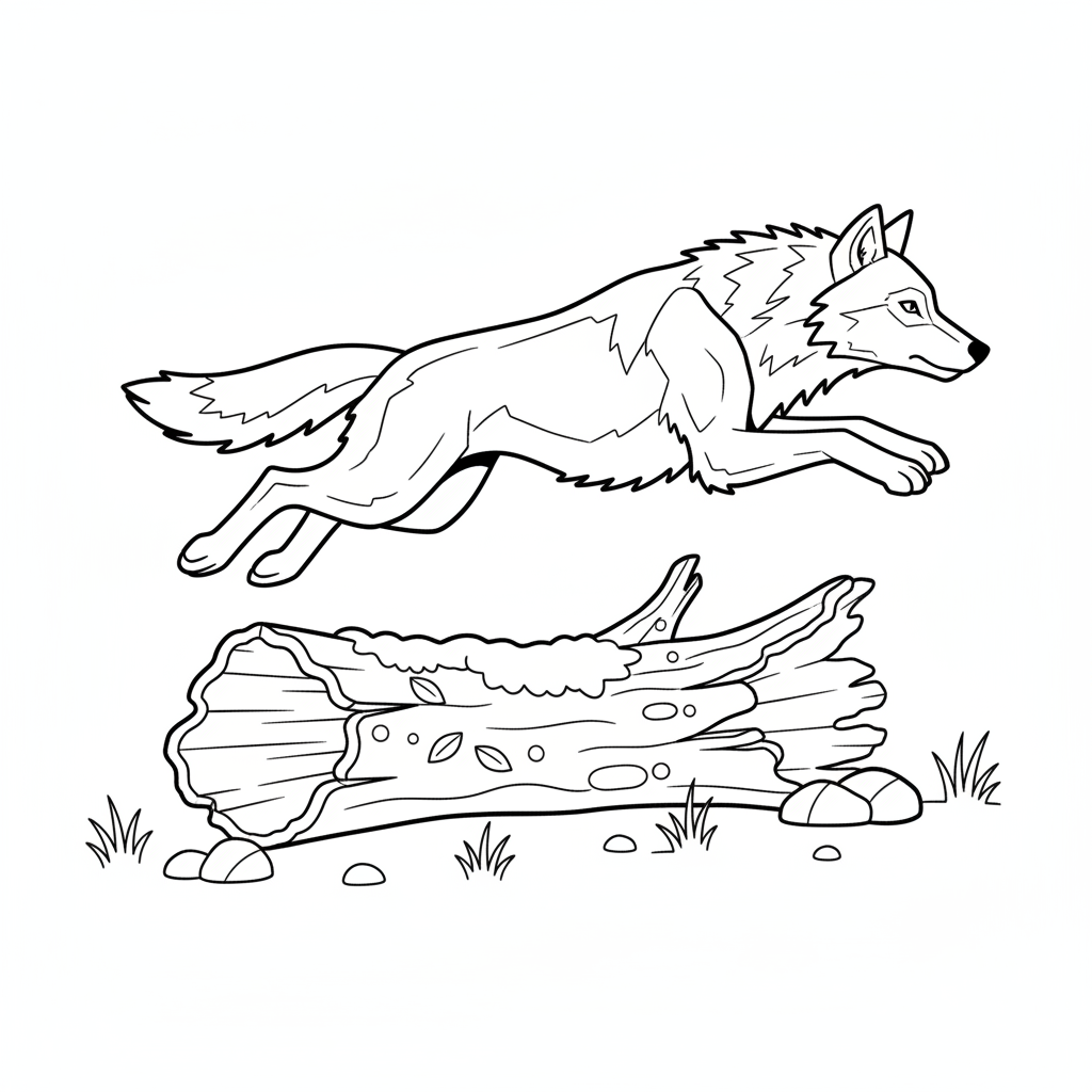 A delightful wolf coloring page featuring wolf leaping over a fallen tree trunk in mid-stride. Perfect for kids and adults who love coloring!
