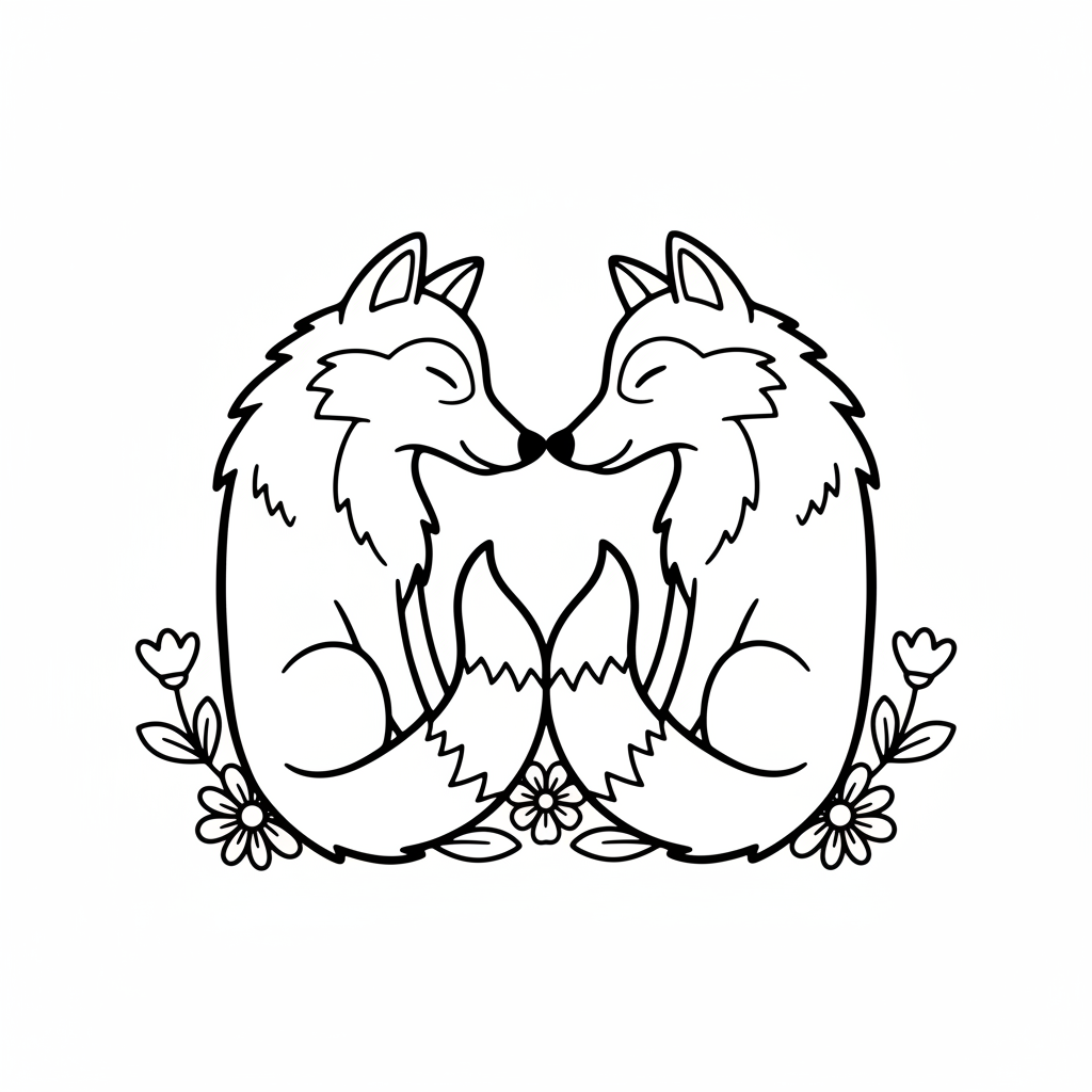 A delightful wolf coloring page featuring wolf pair bonding nose to nose in an affectionate moment. Perfect for kids and adults who love coloring!