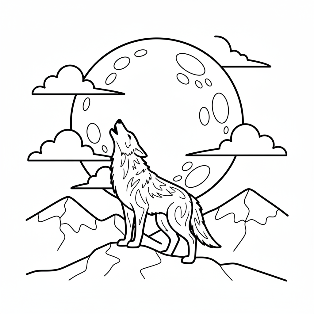 A delightful wolf coloring page featuring wolf silhouette howling against a giant full moon with clouds. Perfect for kids and adults who love coloring!