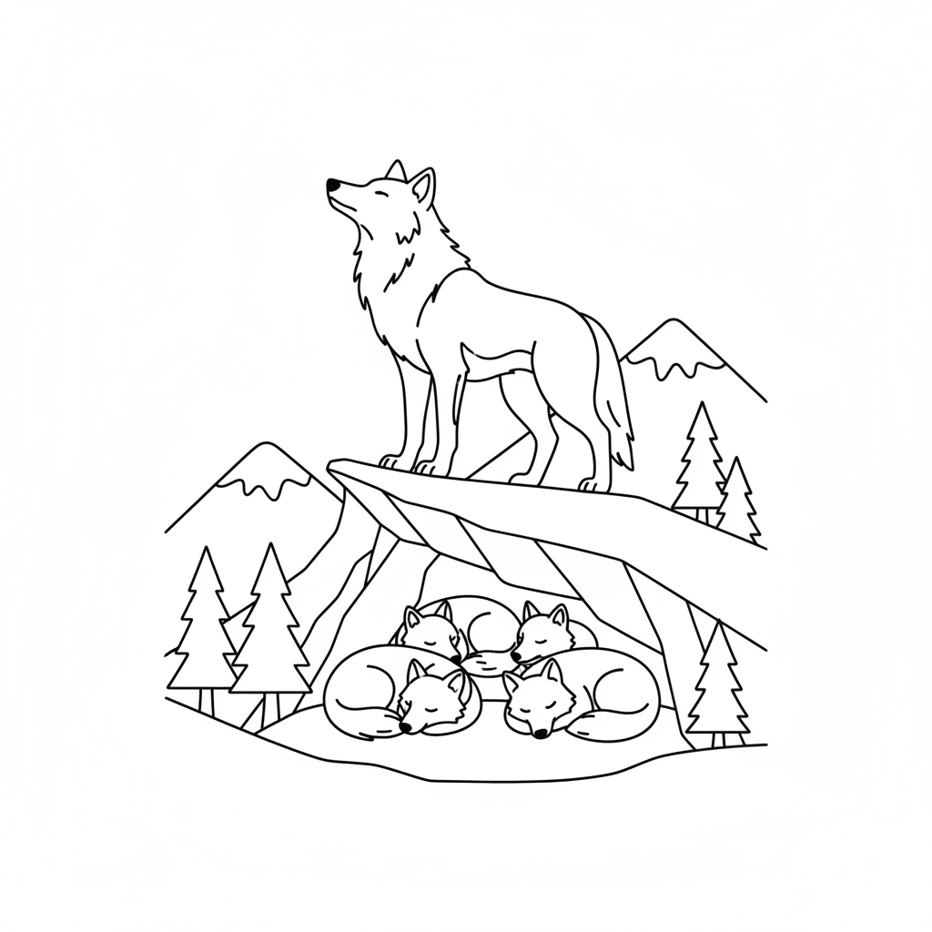 A delightful wolf coloring page featuring wolf standing guard on a ridge while pack sleeps below. Perfect for kids and adults who love coloring!