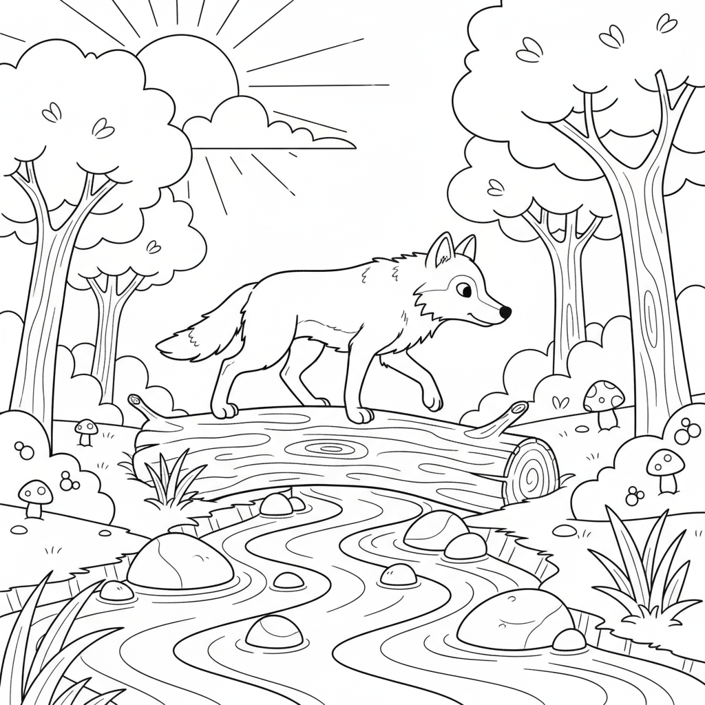 A delightful wolf coloring page featuring wolf walking along a fallen log crossing a forest creek. Perfect for kids and adults who love coloring!